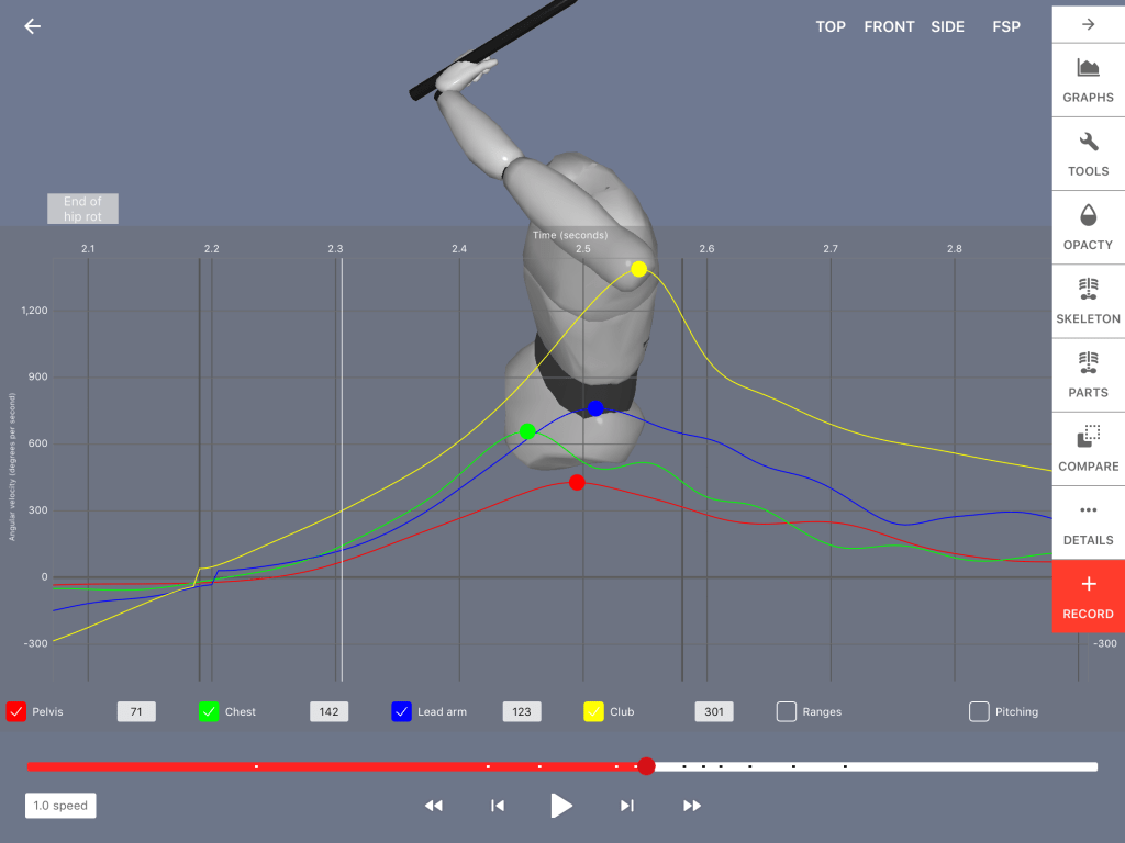 In contrast, notice the professional graph. Near the middle portion of the graph, the arm curve (red) is actually on top of the club curve (blue). This means that the wrist is cocking more just before release, generating torque allowing more angular velocity to be transferred to the club through the efficient use of the stretch-shortening cycle of the forearm muscles.